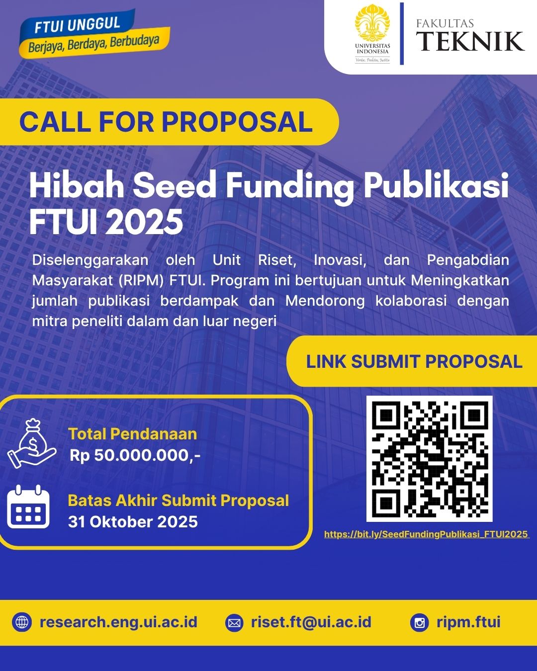 Panduan dan format proposal serta informasi mengenai Program Hibah Seed Funding Publikasi FTUI 2025 dapat dilihat melalui: https://research.eng.ui.ac.id/resources